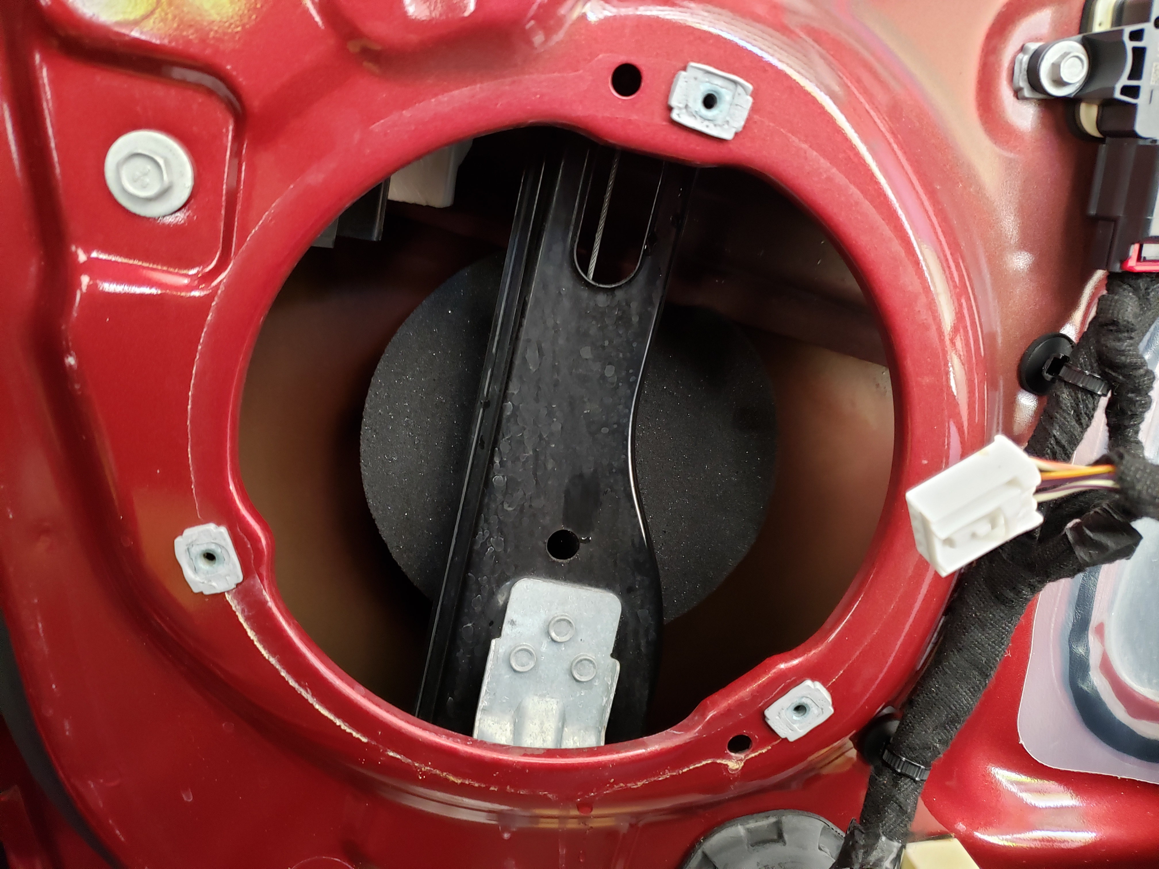 Now that the door panel is moved out of the way, you will be able to access the factory speaker. Start by removing the speaker’s power power that is connected to the side of the speaker’s bracket. Then proceed with removing the three 7mm bolts holding the speaker to the door frame. With all three removed, the speaker will still sit in the frame with the help of a few plastic retention tabs that only require you to pull the speaker and bracket away from the door. Image below shows the connector and the two retention tabs.