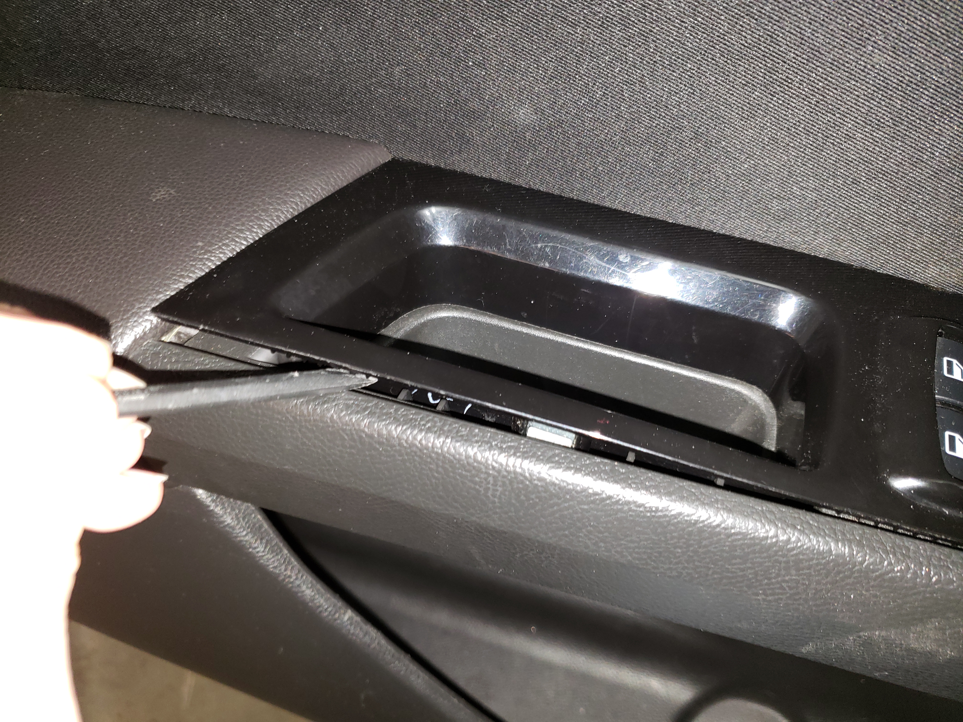 First you’ll remove the plastic trim that is covering the 10mm bolt behind the door handle. Use the plastic spuger to pry underneath the side that is next to the metal mesh. The trim piece uses straight standoffs on this side and uses to angled clips to hook on the opposite side. The picture below shows what the clips looks like to give you a representation of what you’re working with.